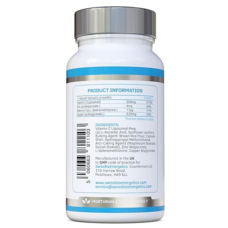 Thông tin sản phẩm Liposomal Vitamin C Complex with Zinc, Selenium and Copper : All-in-ONE Enhanced Absorption Immune Support : 250mg, 120 Vegan Capsules (4 Month Supply) : Non-GMO, Made in UK