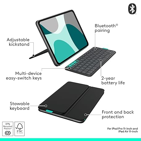 Thông tin sản phẩm Logitech Flip Folio, Keyboard Case for iPad Pro 11-inch (M4 & M5) & iPad Air 11-inch (M2 & M3)(5th Gen - 2024) - Protective & Stowable Bluetooth Keyboard Case, Multi-Device,QWERTY UK Layout-Graphite