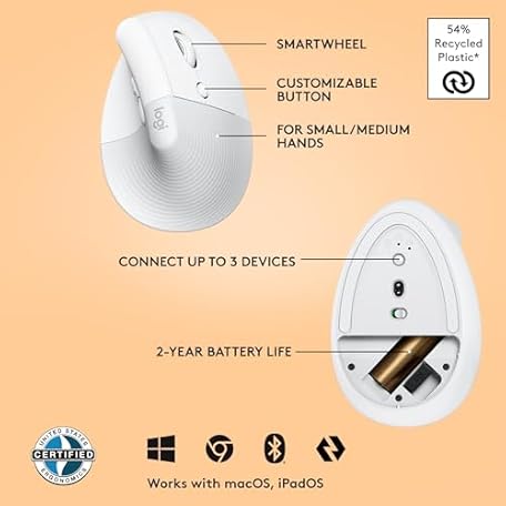 Thông tin sản phẩm Logitech Lift Vertical Ergonomic Mouse, Wireless, Bluetooth or Logi Bolt USB receiver, Quiet clicks, 4 buttons, compatible with Windows/macOS/iPadOS, Laptop, PC - White