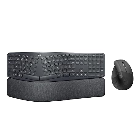Logitech Lift Vertical Ergonomic Mouse, Wireless, Bluetooth or Logi Bolt USB receiver, Quiet, ERGO K860 Wireless Ergonomic Keyboard - Split Keyboard Layout, Wrist Rest, QWERTY UK Layout - Graphite
