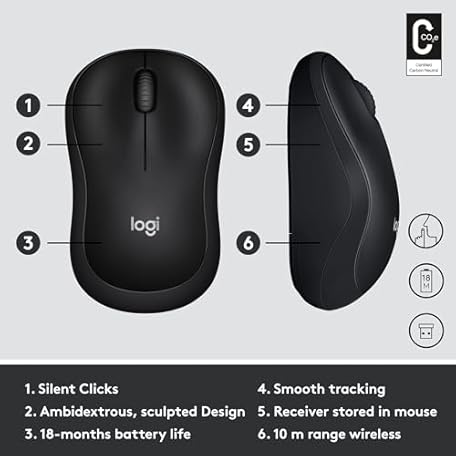 Thông tin sản phẩm Logitech M220 SILENT Wireless Mouse, 2.4 GHz with USB Receiver, 1000 DPI Optical Tracking, 18-Month Battery, Ambidextrous, Compatible with PC, Mac, Laptop - Black