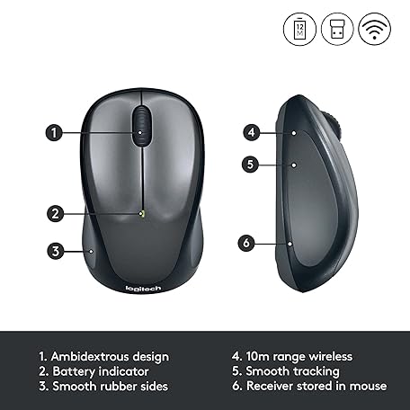 Thông tin sản phẩm Logitech M235 Wireless Mouse, 2.4 GHz with USB Receiver, 1000 DPI Optical Tracking, 12 Month Battery, Compatible with PC, Mac, Laptop, Chromebook - Grey