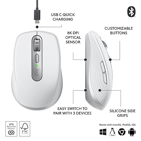 Thông tin sản phẩm Logitech MX Anywhere 3S Compact Wireless Mouse, Fast Scrolling, 8K DPI Any-Surface Tracking, Quiet Clicks, Programmable Buttons, USB C, Bluetooth, Windows PC, Linux, Chrome, Mac - Pale Grey