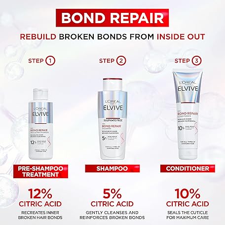 Thông tin sản phẩm L'Oréal Paris Elvive Bond Repair Sulphate-Free Shampoo, with Citric Acid Complex, Restores Original Strength, 98% Less Breakage, 90% More Shine, 82% Stronger, for All Damaged Hair, 200ml
