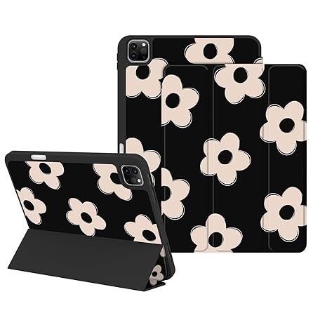 Lornpa Case for iPad Pro 12.9 inch 6th/5th/4th Generation(2022/2021/2020), Protective Case with Pencil Holder, Auto Wake/Sleep Trifold Smart Stand Cute Girly Cover for iPad Pro 6th Gen, Flower Black