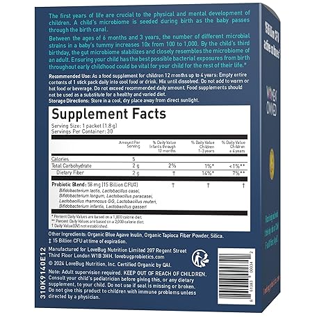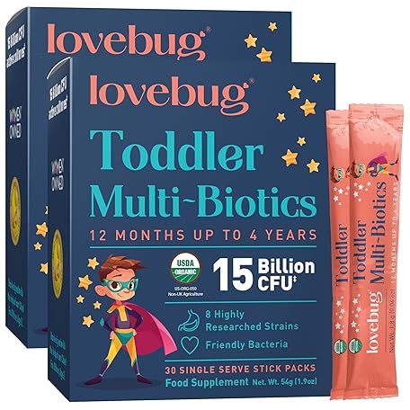 Sản phẩm Lovebug Kids Probiotic Powder - 15 Billion CFU Multi-Strain Formula - Friendly Bio Cultures to Support Gut Health for Children & Toddlers Aged (12 Months to 4 Years) - 60 Unflavoured Sachet Pack đang được bán với giá ưu đãi là $51.0338 tại nước Anh.