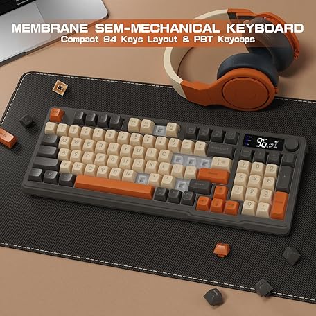 M96 Dual Mode Wireless Gaming Keyboard with 2.4G & BT5.0, 90% Membrane Semi-mechanical Keyboard with Smart Display & Knob, Rainbow Backlit 94 Keys PBT Keycap, 3000mAh Rechargeable for Mac/Win - Grey