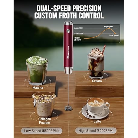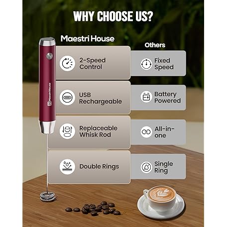 Thông tin sản phẩm Maestri House Rechargeable Milk Frother, Adjustable 2-Speed Handheld Electric Foam Maker Waterproof Detachable Stainless Steel Whisk Drink Mixer Foamer for Lattes, Cappuccino, No Stand