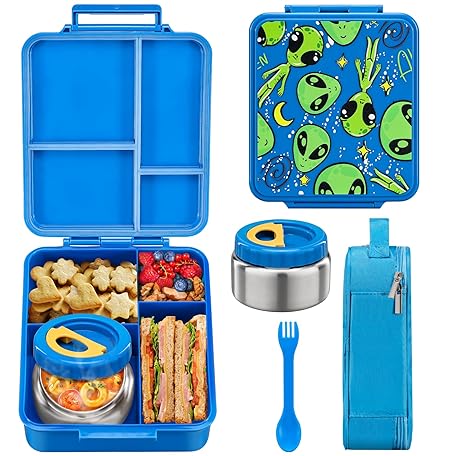 Maison HUIS Bento Lunch Box for Kids with 8 oz Soup Thermos, Leak-Proof Lunch Compartment Containers with 4 Compartments Bento Box, Thermos Food Jar and Lunch Bag, BPA Free, Travel, School (Alien