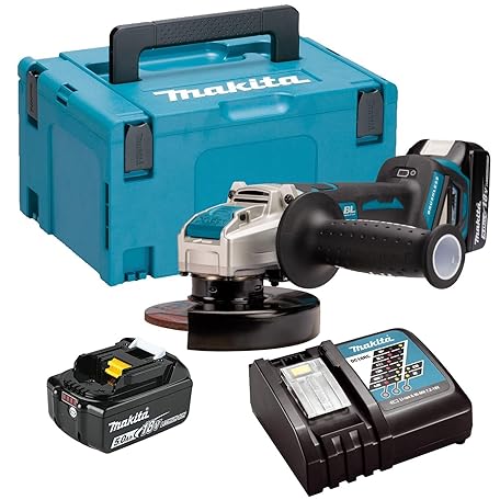 Makita DGA519RTJ Cordless Angle Grinder 18V/5.0Ah with 2 Batteries and Charger in Makpac Blue Black Silver Box