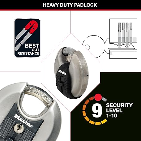 Thông tin sản phẩm MASTER LOCK Heavy Duty Disc Padlock, Security Level 8/10, Outdoor, Keyed, Stainless Steel, Shrouded Shackle