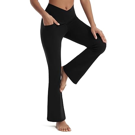 • Maxbee Flare Yoga Pants with Pockets for Women, V Crossover Flare Leggings Tummy Control, High Waist Bootcut Yoga Leggings, Black-front Pockets, Large