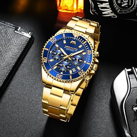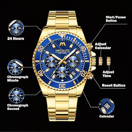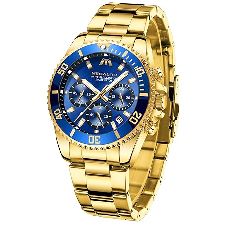 Thương hiệu MEGALITH là cái tên nổi tiếng được rất nhiều khách hàng trên thế giới chọn lựa. Với kiểu dáng đẹp mắt, sang trọng, sản phẩm MEGALITH Mens Watch Chronograph Gold - Stainless Steel Watches for Men Waterproof Designer Mens Wrist Watches Dress Luminous Date Analogue Watch, Gifts for Men là sự lựa chọn hoàn hảo nếu bạn đang tìm mua một món cho riêng mình.