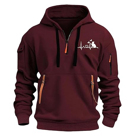 Mens 1/4 Zip Up Hoodie Quarter Zipper Sweatshirts Hooded Multi Pockets Cats Floral Graphic Shirts Long Sleeve Tops(Brick Red, XXXL)