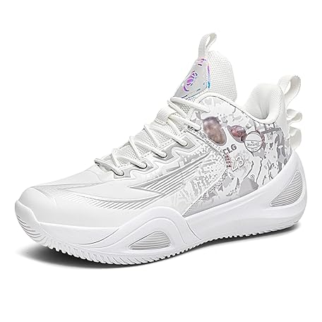 Men's Basketball Shoes Thick-Soled Lightweight Non-Slip Shock-Absorbing Lace-Up Mid-Cut Mesh Breathable Casual Sports(White,10 UK)
