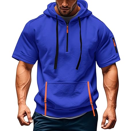 • Mens Quarter Zip Hoodies Short Sleeve 1/4 Zipper Hooded Tshirts with Pockets Running Shirts Sweatshirts Pullover Tops suéter Polo para Hombre(Blue, XL)