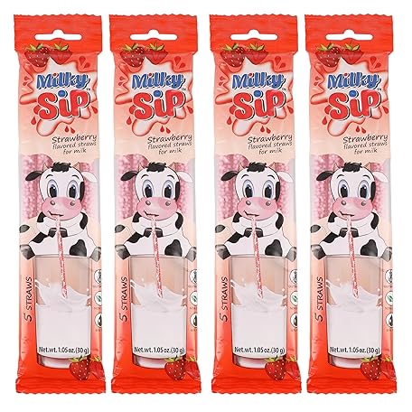 Milky Sip Magical Milk Straws - 4 Packs of 5 Pcs Each Strawberry Flavored Straws For Milk, 20 Milk Flavoring Straws for Kids. Makes Children Want and Love to Drink Milk