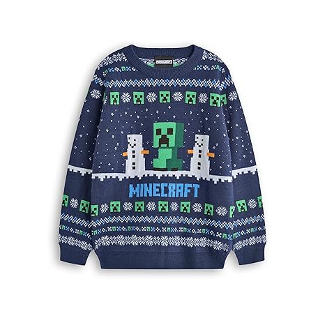 Minecraft Boys Christmas Jumper | Kids Creeper & Snow Golem Characters Graphic Knitted Sweater in Blue | Childrens Selburose Pattern Festive Jumper with Snowmen | Mojang Video Game Merchandise Gift