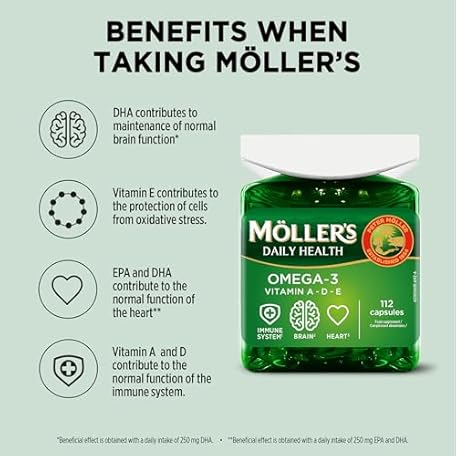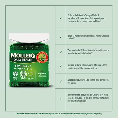 Thương hiệu MÖLLER'S là cái tên nổi tiếng được rất nhiều khách hàng trên thế giới chọn lựa. Với kiểu dáng đẹp mắt, sang trọng, sản phẩm Moller’s ® | Omega-3 Capsules | Fish Oil | Nordic Omega-3 Dietary Supplement with EPA and DHA and Vitamins A, D and E | 166-year-old-brand | Daily Health | 112 Capsules là sự lựa chọn hoàn hảo nếu bạn đang tìm mua một món cho riêng mình.