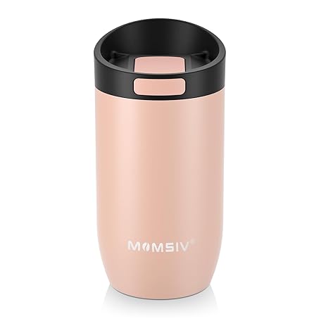 MOMSIV Travel Mug, 350ml Stainless Steel Insulated Coffee Cup with Push Button Lid, Vacuum Reusable Leakproof Double Wall Travel Office Mug for Hot and Cold Drinks, Pink