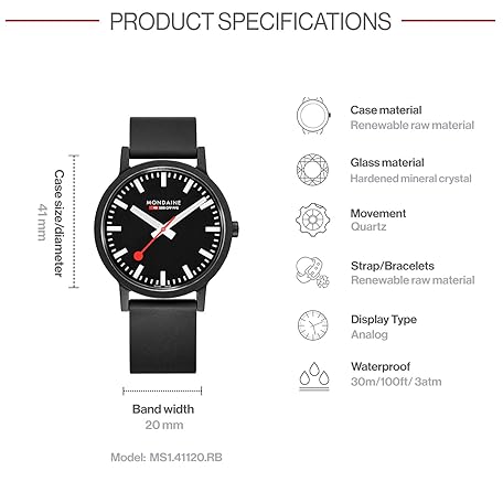 Sản phẩm Mondaine - Essence MS1.41120.RB - Mens Watch 41mm - Official Swiss Railways Wrist Watch Black Renewable Material Strap - 30m Water Resistant Sustainable - Watches for Men đang được bán với giá ưu đãi là $215.1115 tại nước Anh.