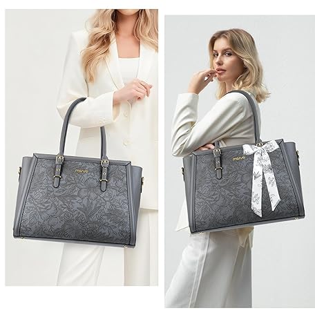 Thông tin sản phẩm MOSISO Laptop Bag for Women, 15.6-16 inch PU Leather Tote Bag Compatible with MacBook, HP, Dell, Asus Notebook, Front Embossed Retro Hibiscus Computer Bag with Silk Scarf&Clutch Purse, Gray