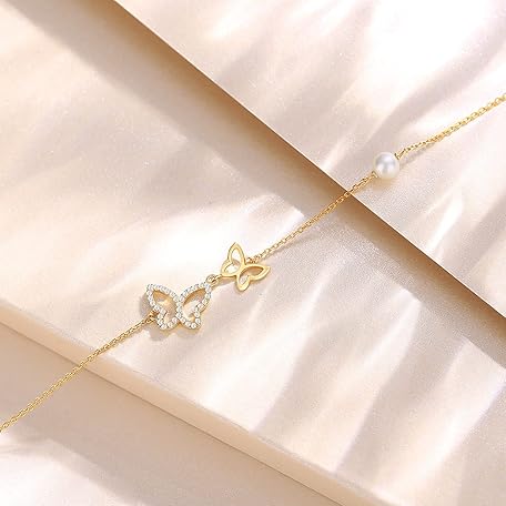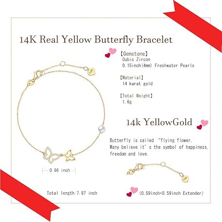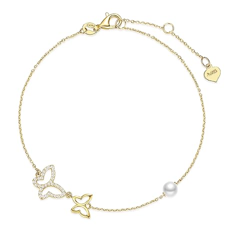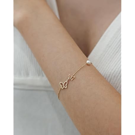 Mothers Day Gift FANCIME Real Solid 14K Yellow Gold Butterfly Bracelet with 4mm Freshwater Pearls Luxury Cubic Zircon Adjustable Bracelet Real Pearl Fine Jewelry for Women Wife Daughter 6.7’’+1.2’’ Extender 1.6g