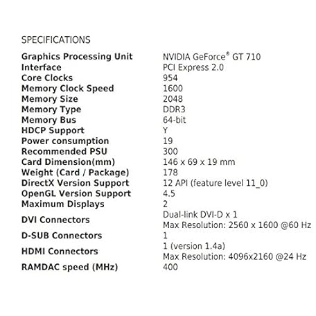 Thông tin sản phẩm MSI GeForce GT 710 2GD3H LP Graphics Card '2GB DDR3, 954MHz, Low Profile, Low Consumption, VGA, DVI-D, HDMI, HTPC, Silent Passive Fanless Cooling System'