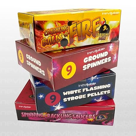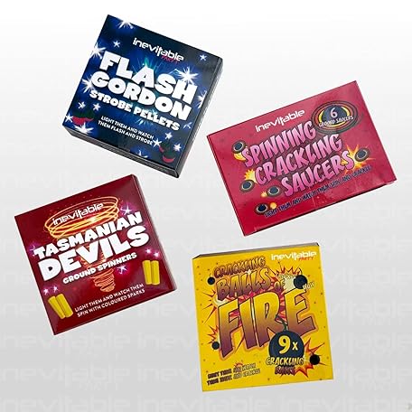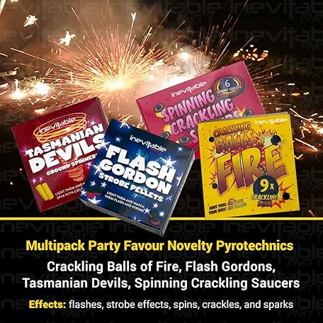 Thông tin sản phẩm Multipack Party Favour Novelty Pyrotechnics | 9 x Crackling Balls of Fire, 9 x Flash Gordon Strobe Pellets, 9 x Tasmanian Devils Ground Spinners and 6 x Spinning Crackling Saucers | Low Hazard 1.4s