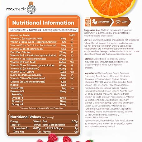 Thông tin sản phẩm Multivitamin for Kids - 120 Natural Raspberry & Orange Flavour Chewable Gummies (2 Month Supply) - Low-Sugar Childrens Multivitamins with Zinc & Omega 3, 6 & 9 - Vegetarian Vitamins for Kids
