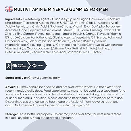 Sản phẩm Multivitamin Gummies for Men | 90 Vegan Gummies | with Added Herbal Extracts Like Maca, Panax Ginseng | 8 Multivitamins and 4 Minerals | Mixed Peach & Orange Flavour | Gluten-Free & Non-GMO đang được bán với giá ưu đãi là $22.7374 tại nước Anh.