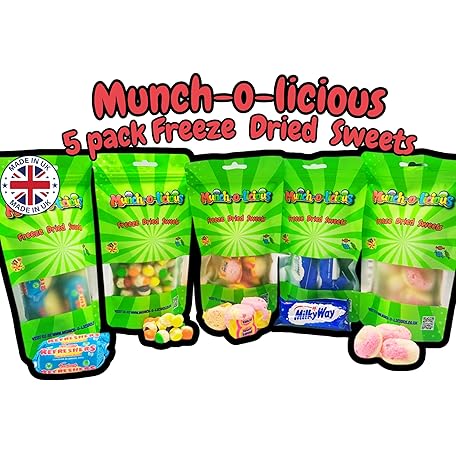 Thông tin sản phẩm Munch-o-licious Freeze Dried Sweets - 5 Pack Favourite Selection: Mix Fruit, Lemon Refresher, Chocolate, Peach Rings, Fruit Salad - Delicious Freeze Dried Candy Treat - Perfect for UK Sweet Lovers