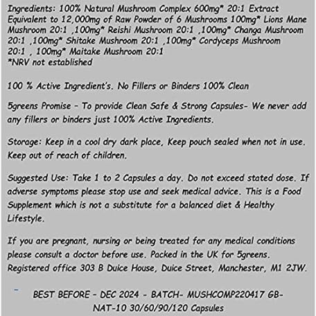 Sản phẩm Mushroom Complex 6 Lions Mane, Reishi,Shitake, Chaga, Cordyceps Maitake 12,000mg No Chemicals 100% Natural 100% Vegan 120 Capsules đang được bán với giá ưu đãi là $24.7212 tại nước Anh.