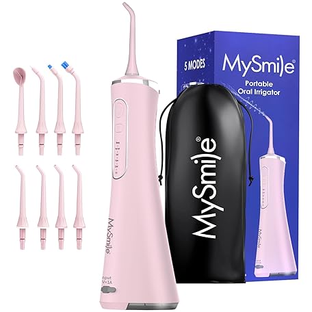 MySmile LP211 Cordless Water Flossers, Portable Rechargeable Oral Irrigator for Teeth Cleaning, 5 Cleaning Modes, IPX7 Waterproof, 8 Replacement Tips and a Storage Pouch (Juicy Pink)