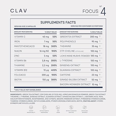 Thương hiệu CLAV là cái tên nổi tiếng được rất nhiều khách hàng trên thế giới chọn lựa. Với kiểu dáng đẹp mắt, sang trọng, sản phẩm N°4 Focus - Nootropics Brain Supplement - with Lions Mane, Ginseng and Ginkgo Biloba, Bacopa Monnieri, CDP Choline, Vitamin B Complex - Cognitive Enhancer for Concentration & Memory - 60 Capsules là sự lựa chọn hoàn hảo nếu bạn đang tìm mua một món cho riêng mình.