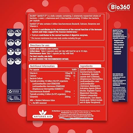 Thông tin sản phẩm Natures Aid Bio360 OptiGUT-D Probiotic 10 Billion Live Bacteria - High Strength Vegan Digestive Gut Health Support - Gut Health Supplement for Adults & Kids - Gluten Free, Non-GMO - 30 Capsules