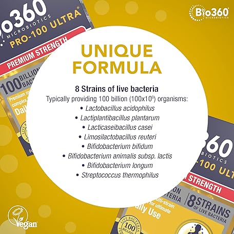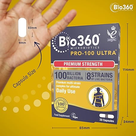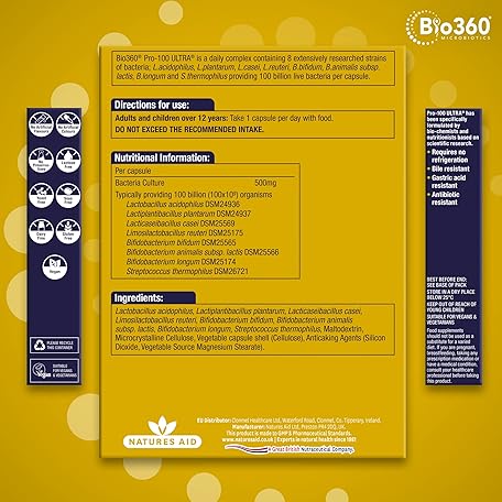 Thông tin sản phẩm Natures Aid Bio360 Pro-100 Ultra Probiotic 100 Billion Bacteria CFU – High Strength Vegan Supplement Supports Digestive Health, Immunity, Gut Flora & Energy – Gluten-Free, Non-GMO - 30 Capsules