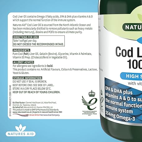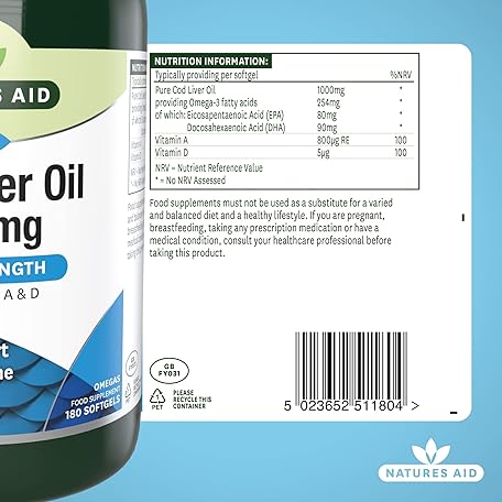 Thông tin sản phẩm Natures Aid Cod Liver Oil 1000mg Softgels – High Strength Omega-3 Fish Oil with Vitamins A & D – Supports Immune System, Heart Health, Brain, Vision, Joints – Non-GMO – 180 Capsules