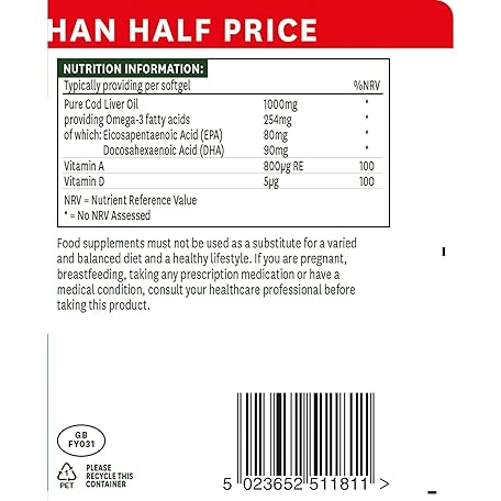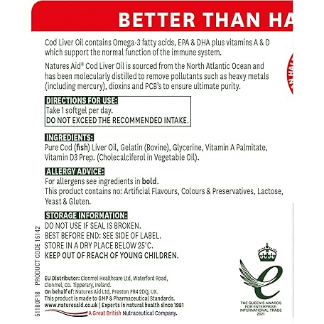 Sản phẩm Natures Aid Cod Liver Oil 1000mg Softgels – High Strength Omega-3 Fish Oil with Vitamins A & D – Supports Immune System, Heart Health, Brain, Vision, Joints – Non-GMO – 180 Capsules đang được bán với giá ưu đãi là $17.1348 tại nước Anh.