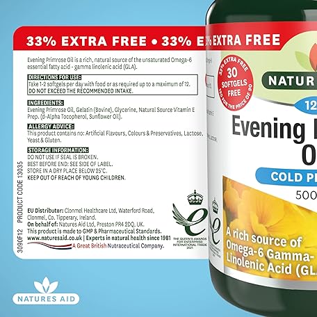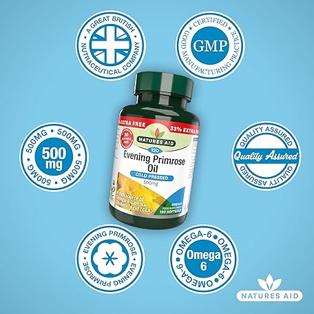 Sản phẩm Natures Aid Evening Primrose Oil 500mg – Cold Pressed Omega-6 GLA – Supports Hormonal Balance, Skin Health & Anti-Inflammatory Function – Non-GMO, Gluten-Free – 120 Softgels đang được bán với giá ưu đãi là $14.3444 tại nước Anh.