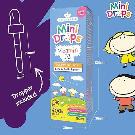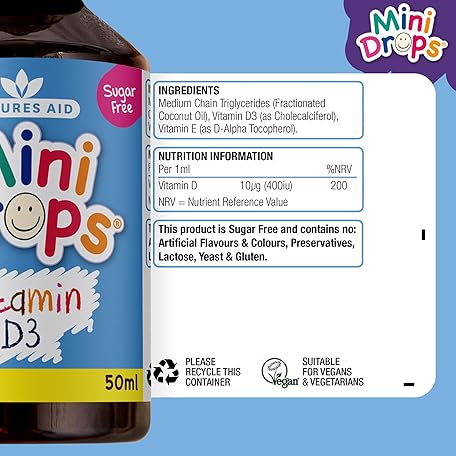 Thông tin sản phẩm Natures Aid Mini Drops Vitamin D3 50ml for Infants & Kids - Bone, Teeth, Health & Immune System Support - Sugar Free, Vegan, Gluten-Free, Non-GMO - Growth Support for Children Age 0-5 Dropper Included
