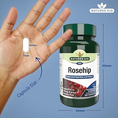 Thông tin sản phẩm Natures Aid Rosehip 750mg 120 Capsules – High Strength Rosa Canina Extract for Joint Support, 3000mg Equivalent of Dried Fruit, Vegan, Gluten-Free, Vegetarian, No Gummies or Tablets