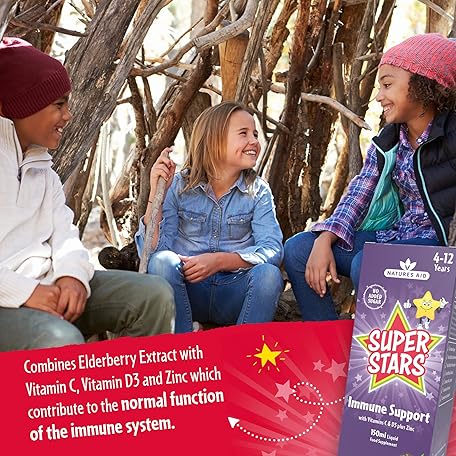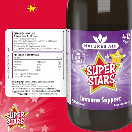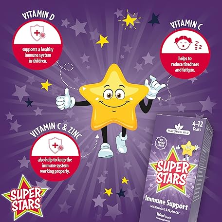 Sản phẩm Natures Aid Super Stars Immune Support for Kids 150ml - Blackcurrant Flavour - Vitamin C D3 Zinc - Vegan, Sugar-Free, Gluten-Free - Non-GMO - Daily Immune Support Liquid Supplement đang được bán với giá ưu đãi là $10.3223 tại nước Anh.