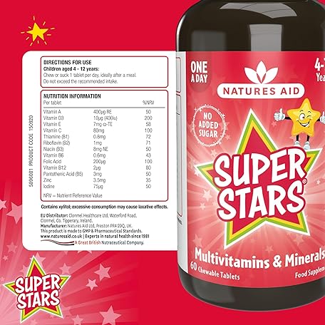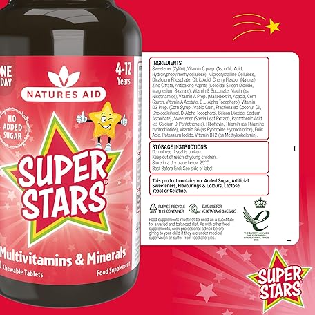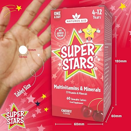 Sản phẩm Natures Aid Super Stars Multivitamin & Minerals - Immune Support, Growth & Development - Natural Fruit Flavour Multi-vitamins for Kids Aged 4-12 Years - Vegan Non-GMO Gluten-Free - 60 Chewable Tablets đang được bán với giá ưu đãi là $11.5758 tại nước Anh.