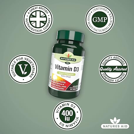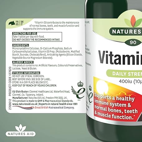Thông tin sản phẩm Natures Aid Vitamin D3 10µg (400IU) – High Strength Vitamin D Supplement – Supports Bones, Muscles & Immunity – Vegan, Gluten-Free, Non-GMO – 90 Tablets – Essential Daily Nutrient