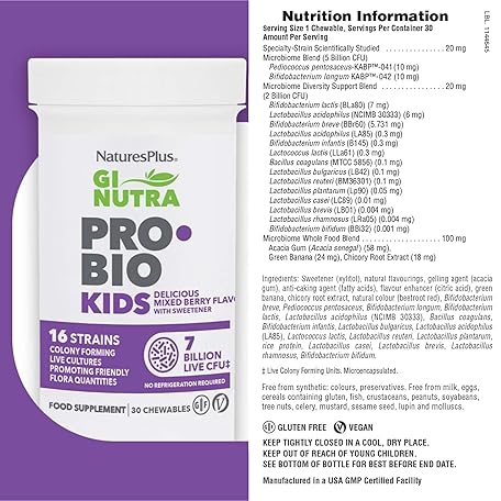 Thông tin sản phẩm NaturesPlus GI NUTRA Pro Bio Kids - 16 Live Strains, 7 Billion Probiotics for Children with Prebiotics Fibre Complex - L Acidophilus, B. Longum - Vegan, Gluten Free - 30 Chewable Tablets