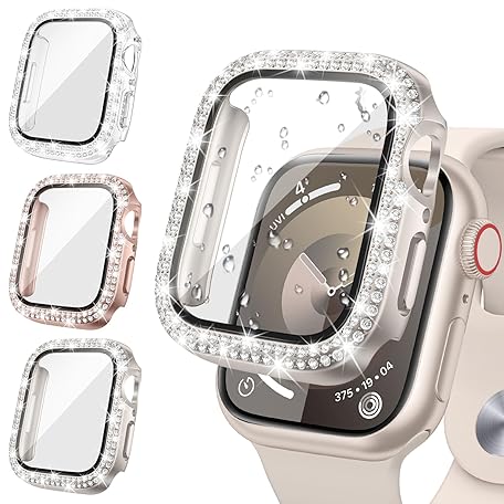 Neitra [3Pack] for Apple Watch Screen Protector Case Series 9 8 7 45mm Accessories, iWatch Hard PC Diamond Bumper Case Built-in Tempered Glass Film, Protective Bling Face Cover for Women Girls, 45 mm