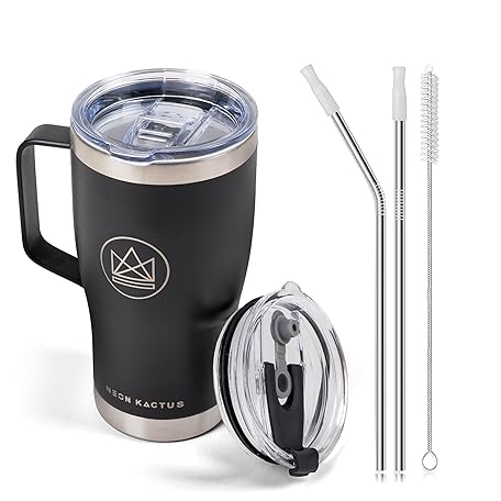 Neon Kactus 600ml/20oz Insulated Travel Mug with Handle, 2 x Stainless Steel Straws & 2 x Spillproof Lids, Vacuum Double Wall Stainless Steel Tumbler for Hot & Cold Drinks - Rock Star