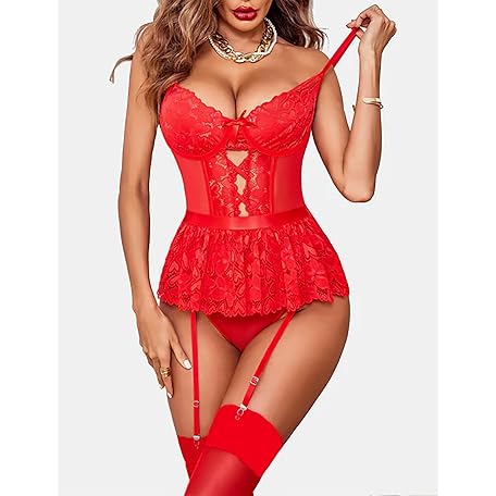 NewBull Sexy Lace Lingerie Women Transparent Mesh Shapewear Bdysuit with Garter and Stockings Flowers Embroidery Babydoll Teddy Leotard Suspenders Backless Pyjamas with Bows