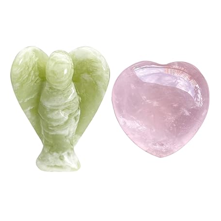 Neyisaa 1.5" Prayer Guardian Angel Statue & Heart Love Pocket Stone Set, Carved Palm Stones Figurines Healing Reiki Meditation, Light Green Jade & Rose Quartz